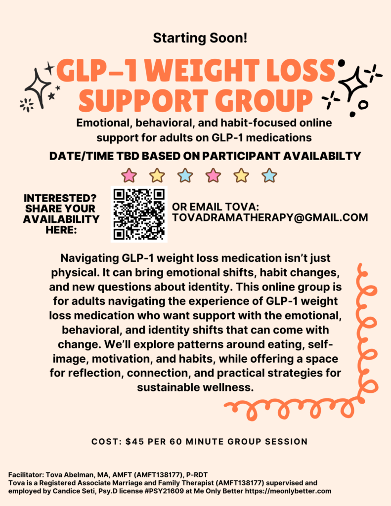 I have weight loss support group up and running; the others are forming soon. If you’d like to join any of these groups, email me (tovadramatherapy@gmail.com) and we’ll set up a free intro call to make sure it’s a good fit.